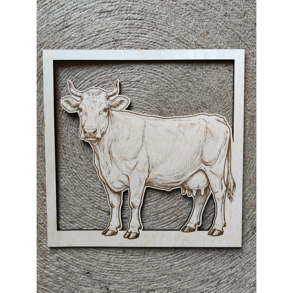 Vzdušný a lehký obraz na stěnu s výřezem krávy, ohraničený rámem. Bez Vrtání .