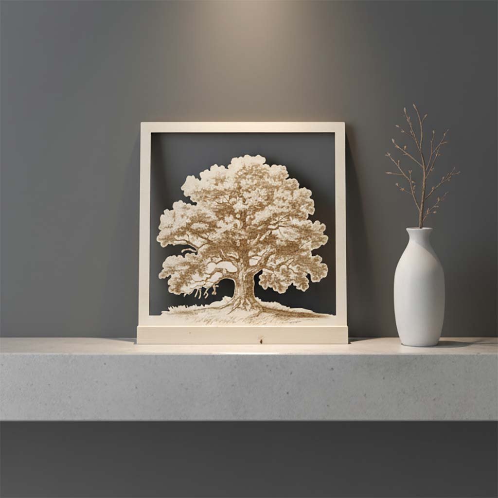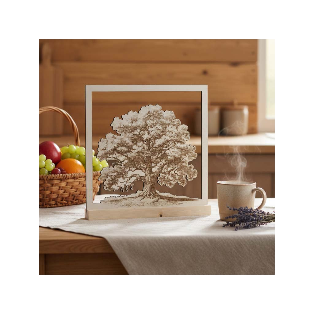 Tento dřevěný obraz strom je originální dekorace, která v sobě spojuje přírodní krásu dřeva a symboliku života. Obraz je vyřezán z kvalitní březové překližky, přičemž každý kus je jedinečný díky kresbě a struktuře materiálu. Motiv stromu představuje stabilitu, růst a propojení s přírodou – ideální volba pro domov, kancelář nebo jako dárek.