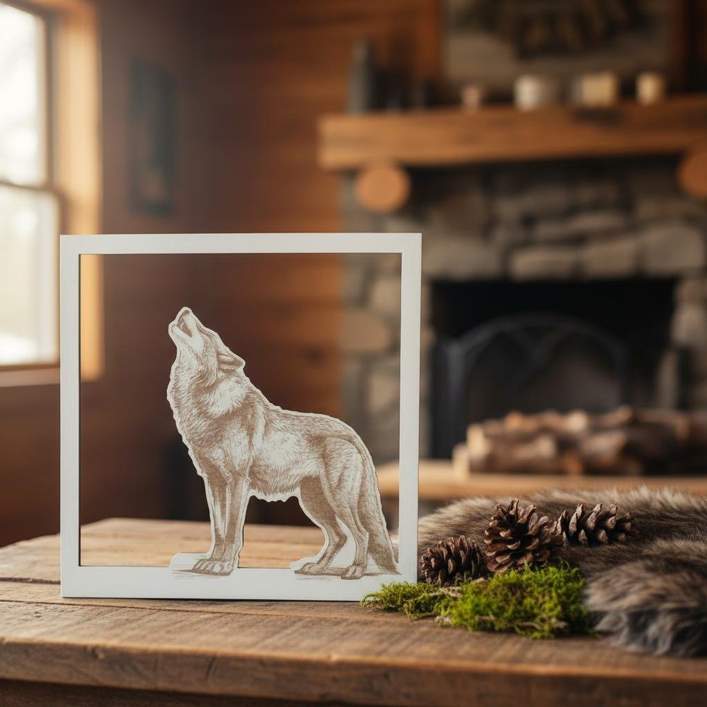 Vzdušný a lehký obraz na stěnu s výřezem vlka a ohraničený rámem. Bez Vrtání