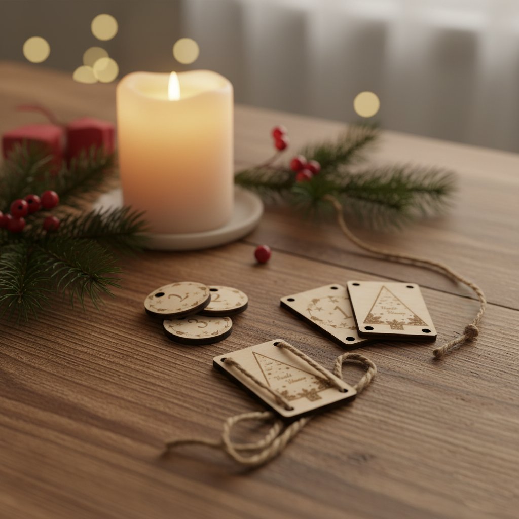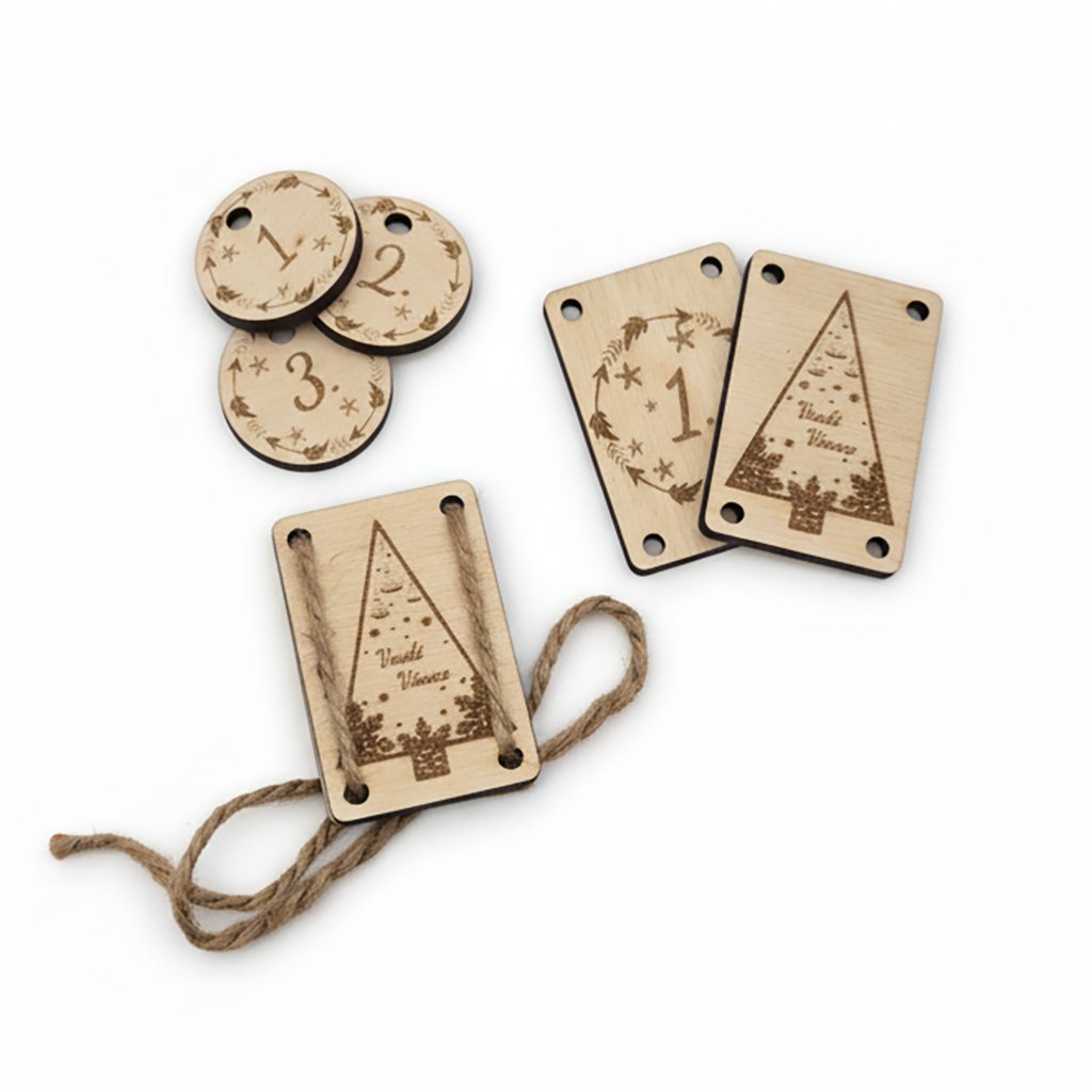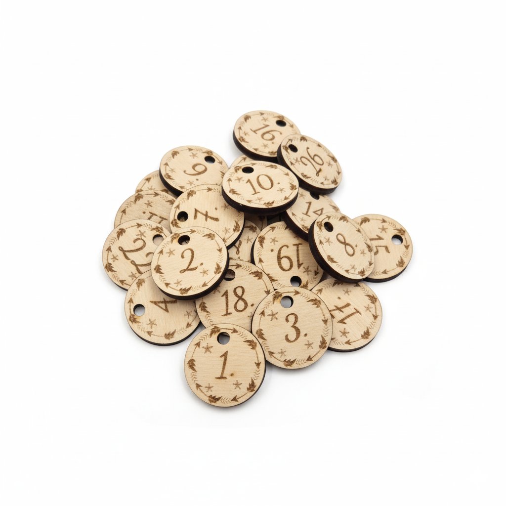 Sada 24 dřevěných žetonů s vygravírovanými čísly od 1 do 24 a jemným dekorem hvězdiček. Každý žeton má otvor pro snadné zavěšení na provázek nebo stuhu. Vyrobeno z kvalitní překližky, přírodní vzhled dodá vašim dekoracím rustikální kouzlo. Perfektní pro adventní kalendáře, označení dárků, DIY projekty nebo sváteční výzdobu.