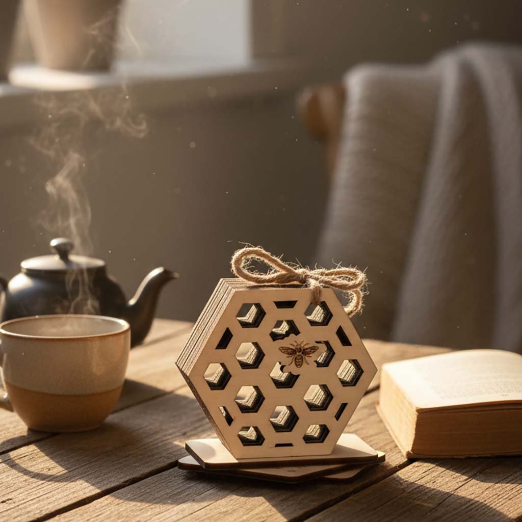 Dekorativní dřevěné podtácky ve tvaru šestiúhelníku inspirované strukturou včelí plástve. Každý kus je precizně vyřezán laserem z kvalitní březové překližky a uprostřed zdoben jemným gravírováním včelky. Díky přírodnímu vzhledu a originálnímu designu se skvěle hodí do moderních i rustikálních interiérů. Podtácky chrání povrch stolu před poškozením a zároveň působí jako stylový doplněk.
