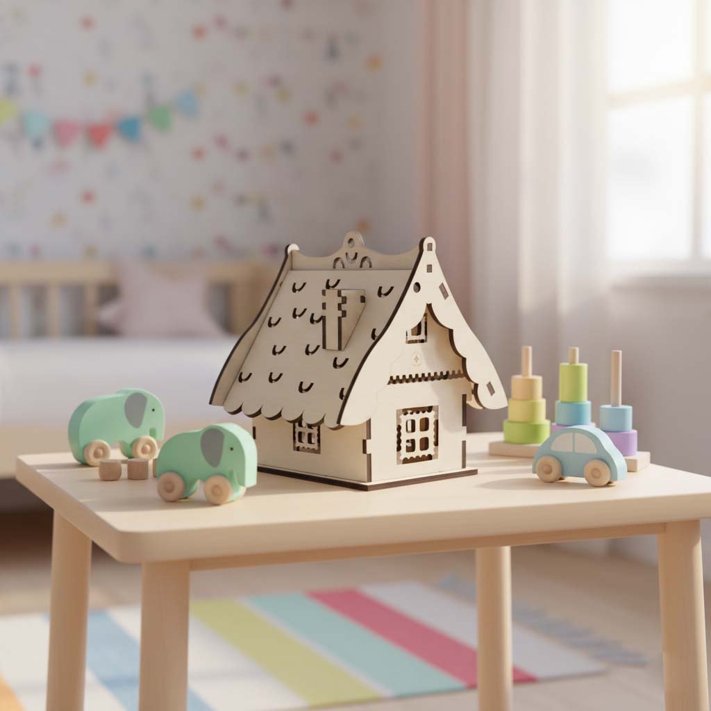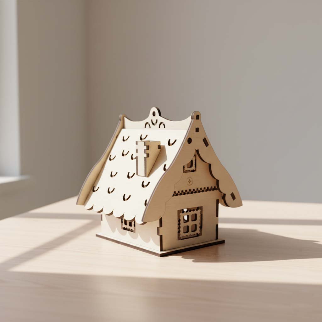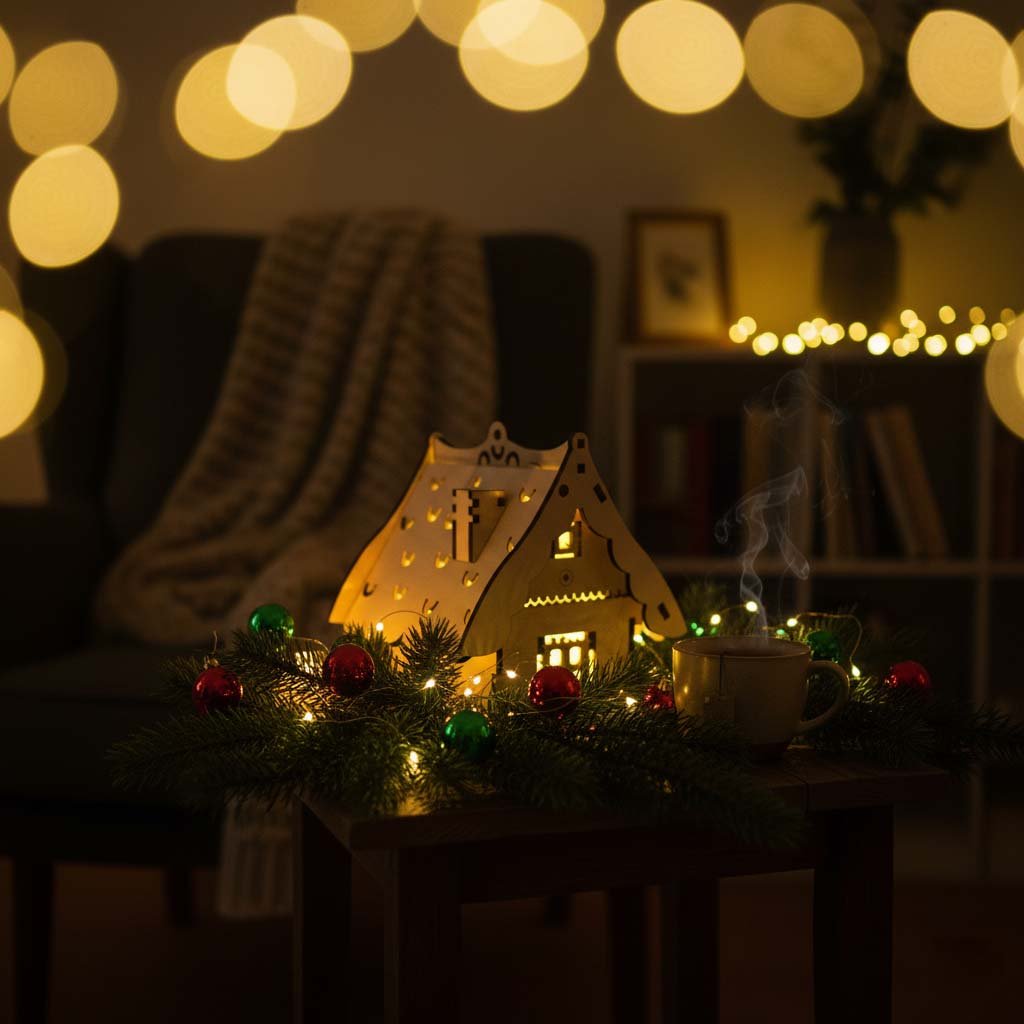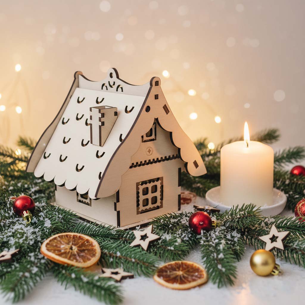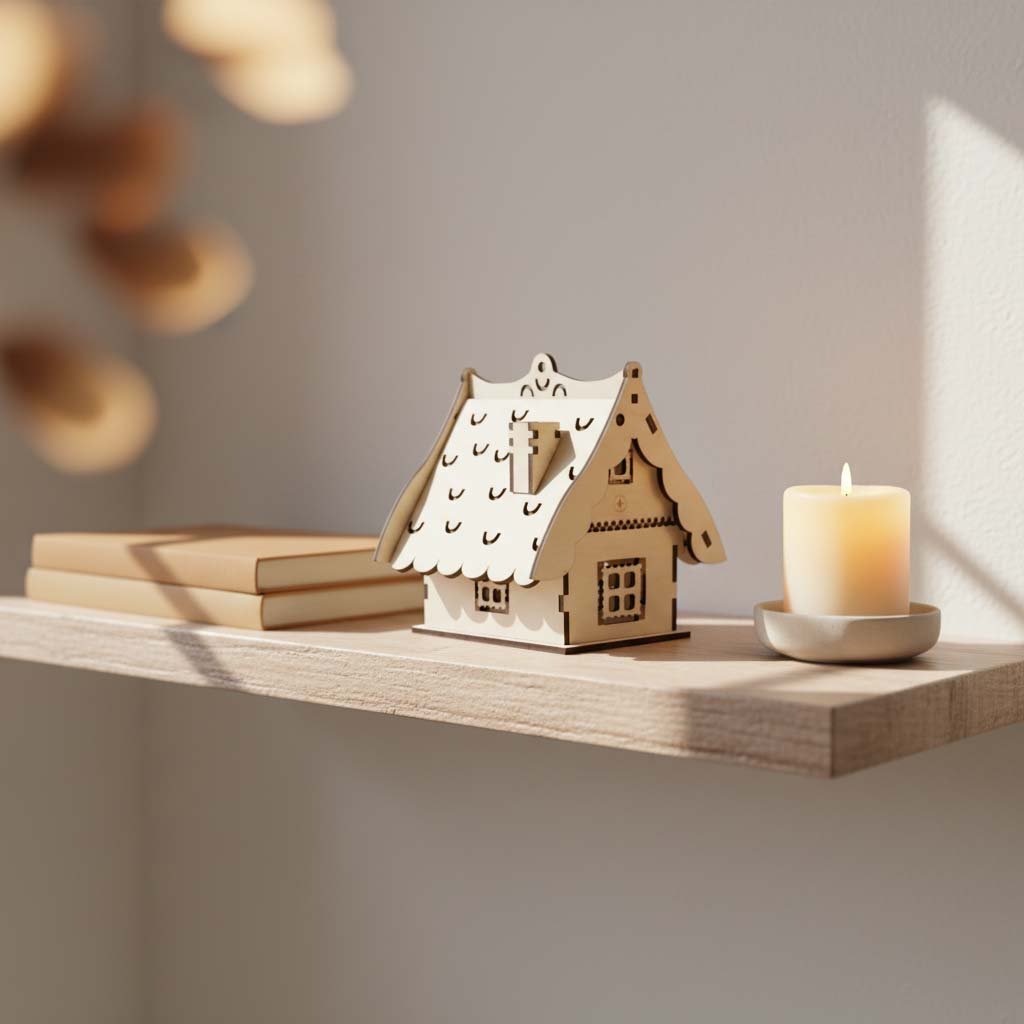 Dřevěný svícen Kouzelná chaloupka je originální dekorace, která vnese do vašeho domova teplo a pohodu. Tento svícen je vyroben z kvalitní přírodní překližky a zdoben precizním laserovým gravírováním, díky čemuž vynikají jemné detaily a elegantní design. Po vložení LED svíčky se domeček rozzáří příjemným teplým světlem, které proniká skrz vyřezávané ornamenty a vytváří kouzelnou hru stínů na stěnách.