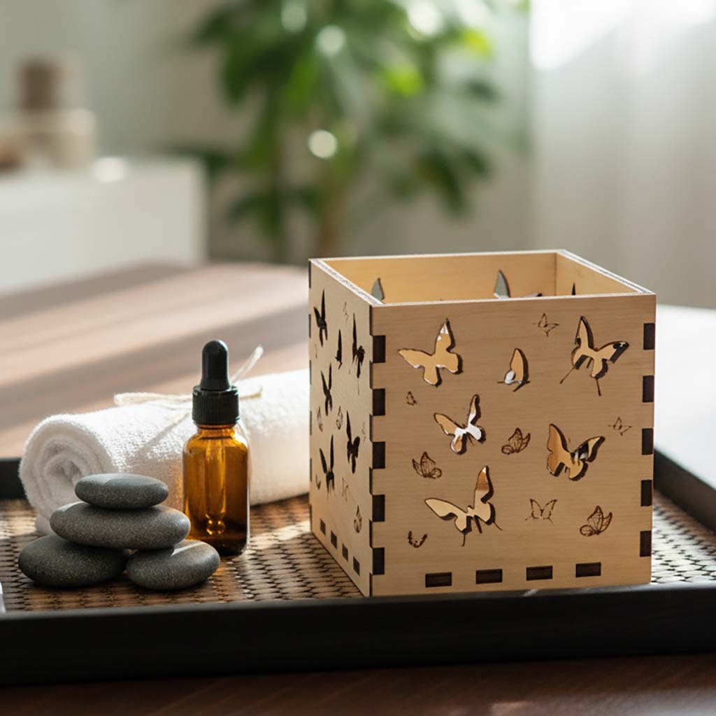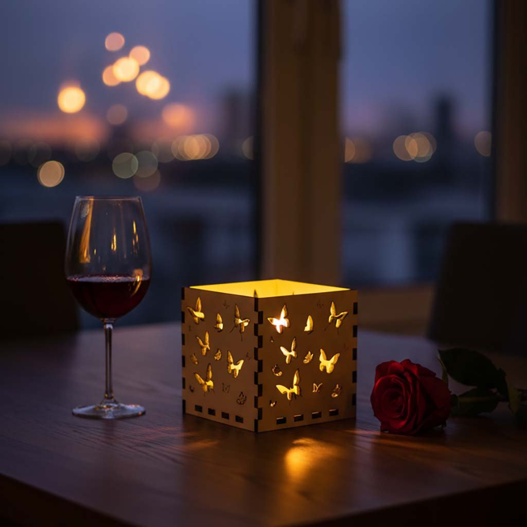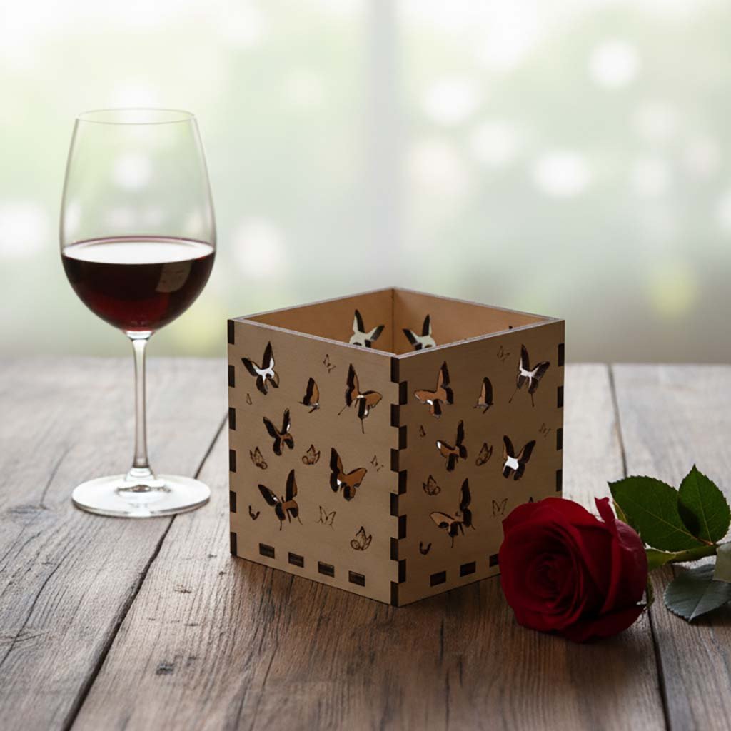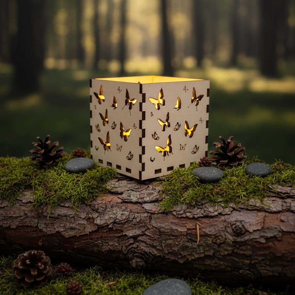 Originální dřevěný svícen vyrobený z kvalitní březové překližky o síle 4 mm. Každá stěna je zdobena detailním laserovým gravírem – motivem motýlků a navozuje atmosféru rozkvetlé louky a letního dne.