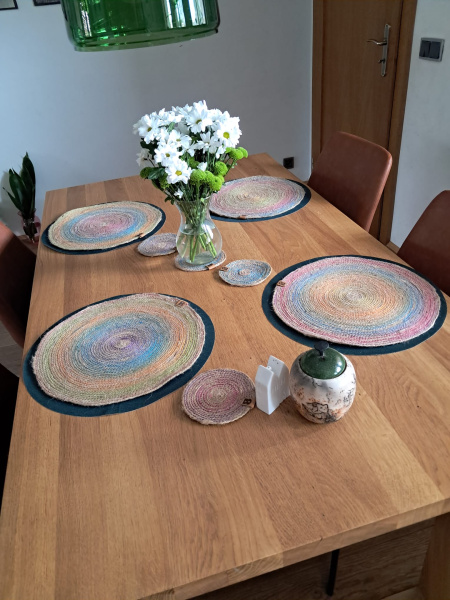 Šiju podložky pod skleničky, až velká 70cm kola (na stůl i pod nožky). Mám stálou nabídku podložek